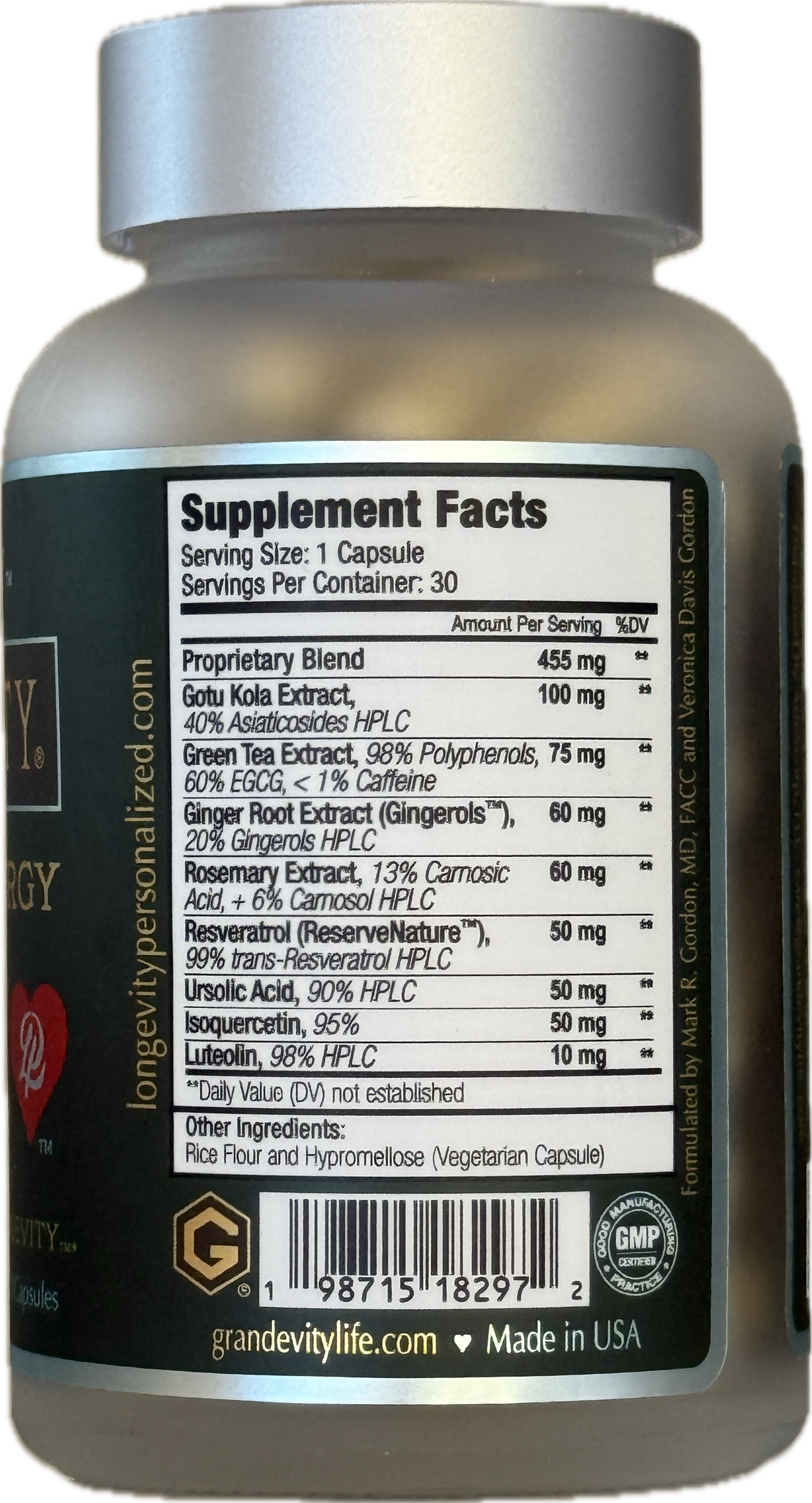 Packed with Gingerols from Ginger root extract, Ursolic Acid, Gotu Kola, and a powerhouse of antioxidants like Carnosol and Carnosic Acid from Rosemary Extract, along with Green Tea Extract, Resveratrol, Isoquercetin, and Luteolin, each capsule is designed to address key pathways involved with health and longevity including Nrf2, mTOR, AMPK, IGF-1, Sirtuins, and Telomeres.*